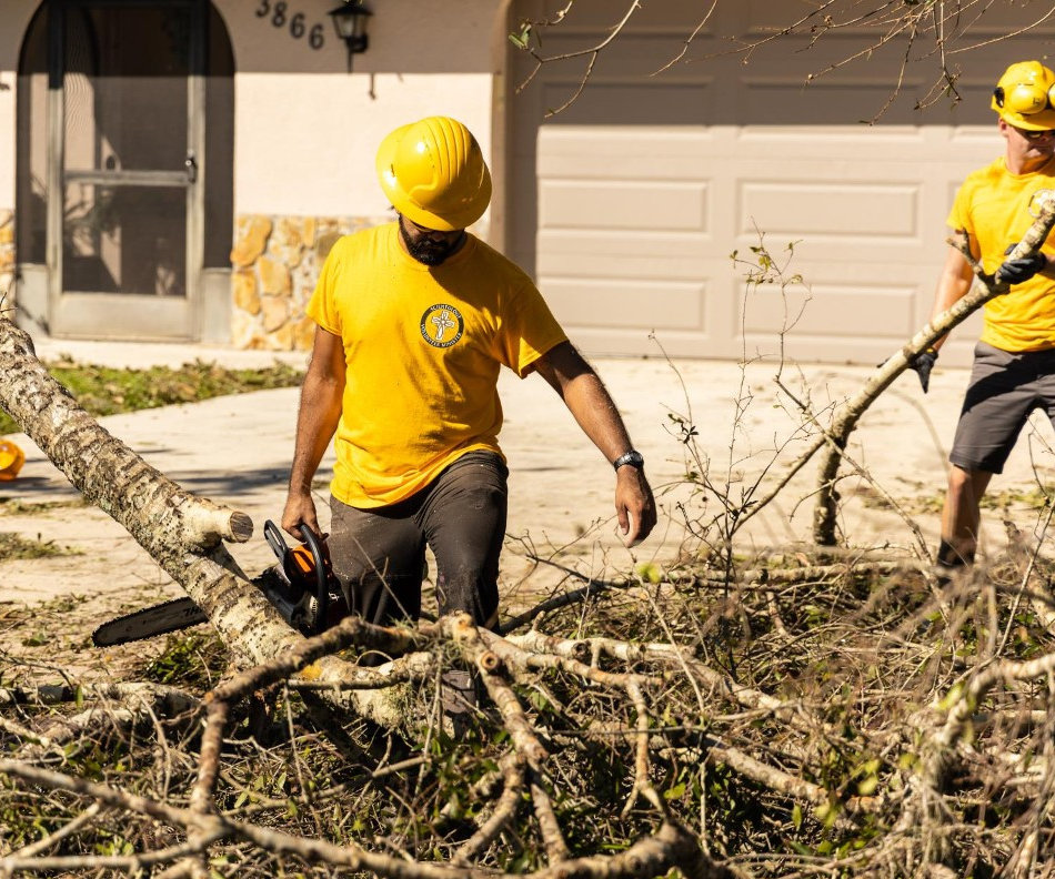 Il a fallu de nombreuses heures à une autre équipe de Ministres Volontaires pour nettoyer les débris dans et autour de la maison d’une femme. Ils lui ont envoyé des photos de la maison quand ils avaient fini, et elle les a appelés en larmes, les remerciant pour leur aide. Ils ont coupé un arbre qui était tombé sur une maison et ont aidé un vétéran de 97 ans à déblayer les dommages causés par la tempête qui avaient recouvert sa maison.