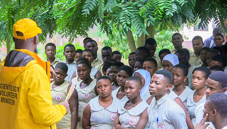 Les tournées de bienfaisance de nos Ministres Volontaires se rendent dans des lieux qui autrement n’auraient aucun accès aux outils pratiques du Manuel de Scientology contenus dans ces 19 cours. Chaque endroit reçoit des services adaptés à ses besoins spécifiques. Pour la tournée de bienfaisance au Ghana, le problème était l’éducation.