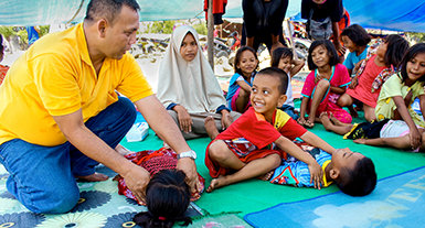Puis à 1649 kilomètres de là, dans la ville côtière de Palu, à Sulawesi, un séisme de 7,5 sur l’échelle de Richter a frappé, créant un tsunami dans son sillage et tuant environ 4340 personnes. Abdi Surbakti a confié les ateliers pour les écoles de Lombok à une équipe locale qu’il avait formée et est parti à Palu. La situation là-bas était la même. Un ministre volontaire a dit : « Certaines écoles à Palu ne sont pas encore actives à cause des tremblements et elles se souviennent encore que l’une des écoles a été submergée par la boue pendant le tremblement de terre. »